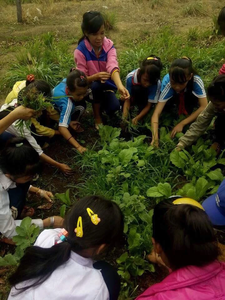 Các em học sinh cùng trồng rau. Ảnh: Facebook Khỏe Tám