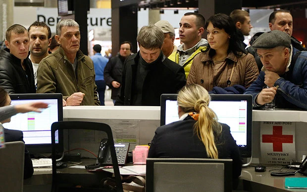 (PLO) - Những hình ảnh đầu tiên của thân nhân các hành khách có mặt trên chuyến bay của Nga rơi tại bán đảo Sinai (Ai Cập). Những hành khách này đang chờ đợi thông tin cập nhật về vụ tai nạn tại sân bay quốc tế Pulkovo, ngoại ô thành phố St Peterburg. Toàn bộ những người trên máy bay đều là người Nga. (Nguồn ảnh: EPA)