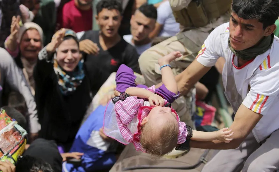 Một đứa trẻ đang được bồng bế ở ngoại ô Baghdad, 17 – 4 – 2015