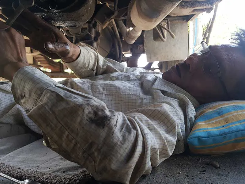 Anh Nguyễn Văn Thông sửa xe ben cho anh Hồ Thanh Sơn cuối tuần vừa qua. Ảnh: H.MINH