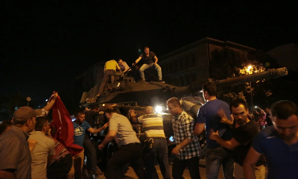 Người dân cố tìm cách chặn xe tăng của phe đảo chính tiến sâu vào trung tâm thành phố. Ảnh: AP