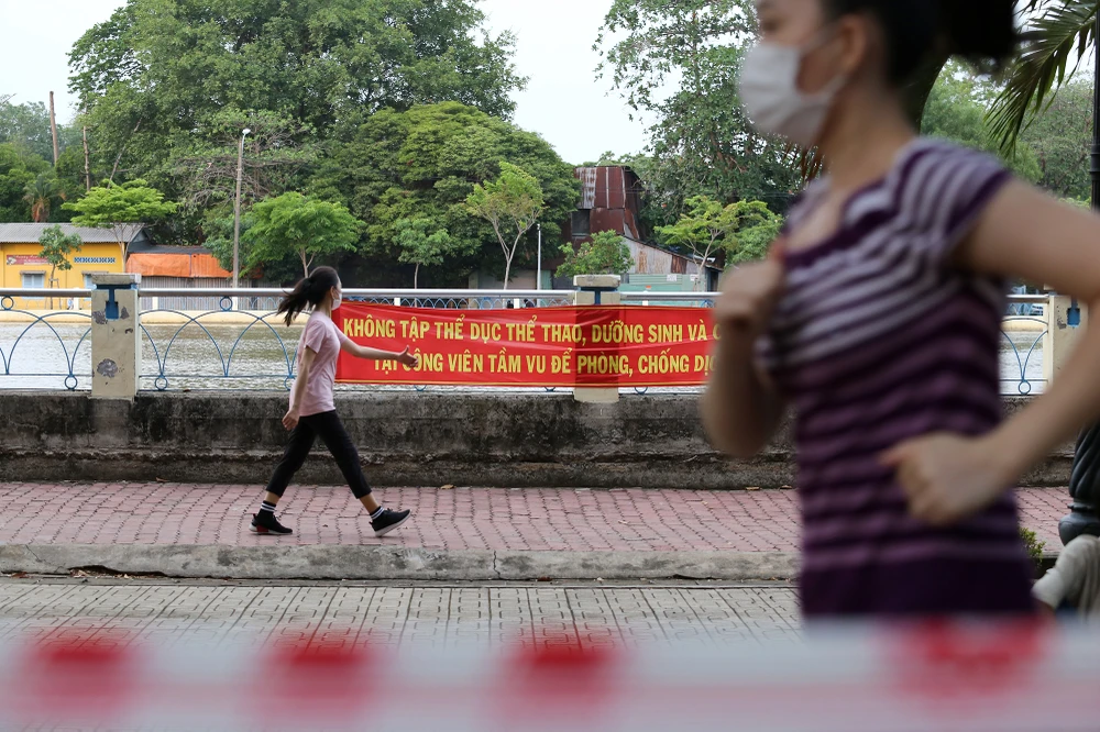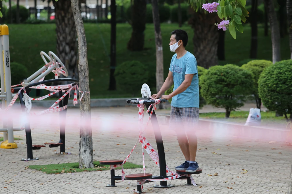Lực lượng chức năng dùng dây rào quanh công viên nhưng nhiều người vẫn bất chấp vào để tập thể dục. Một vài trường hợp không đeo khẩu trang và ngay sau đó được bảo vệ công viên nhắc nhở.