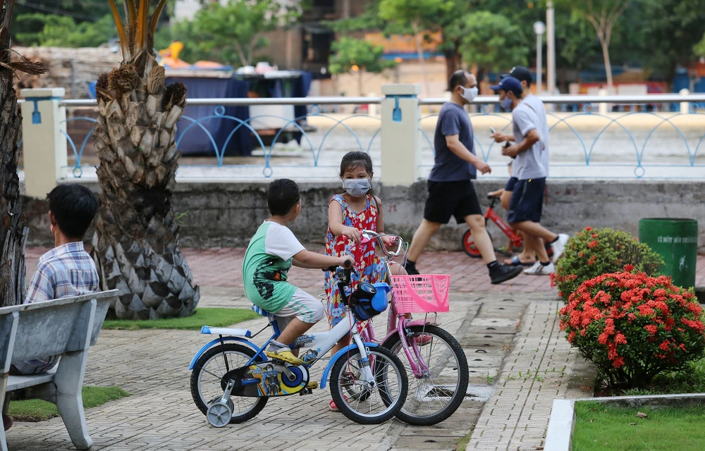 Các em nhỏ được người thân đưa ra công viên chơi vào buổi chiều.