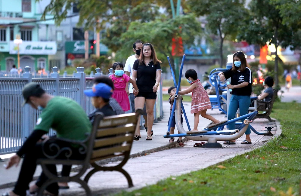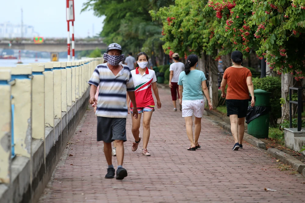 Nhiều người tập thể dục tại công viên dọc bờ kênh Nhiêu Lộc - Thị Nghè (quận 3) chiều 10-4, có người không đeo khẩu trang.