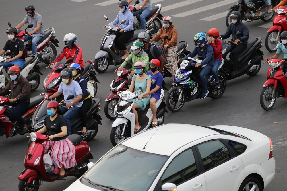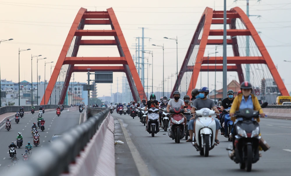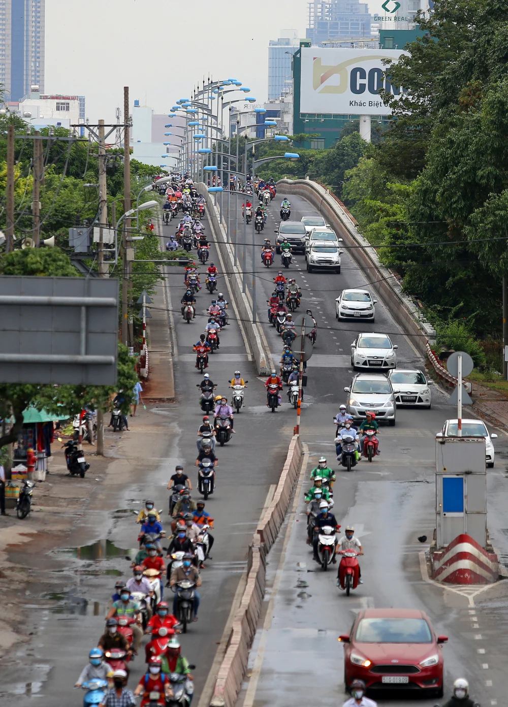 Trên đường Phạm Văn Đồng đoạn qua cầu Bình Lợi, các phương tiện xuất hiện đông đúc ở cả hai chiều di chuyển, đặc biệt là ở làn xe máy.