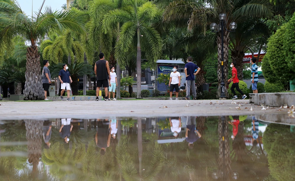 Người dân vẫn thản nhiên tập thể dục ở công viên dù có thông báo không tập thể dục tại công viên để phòng, chống dịch.
