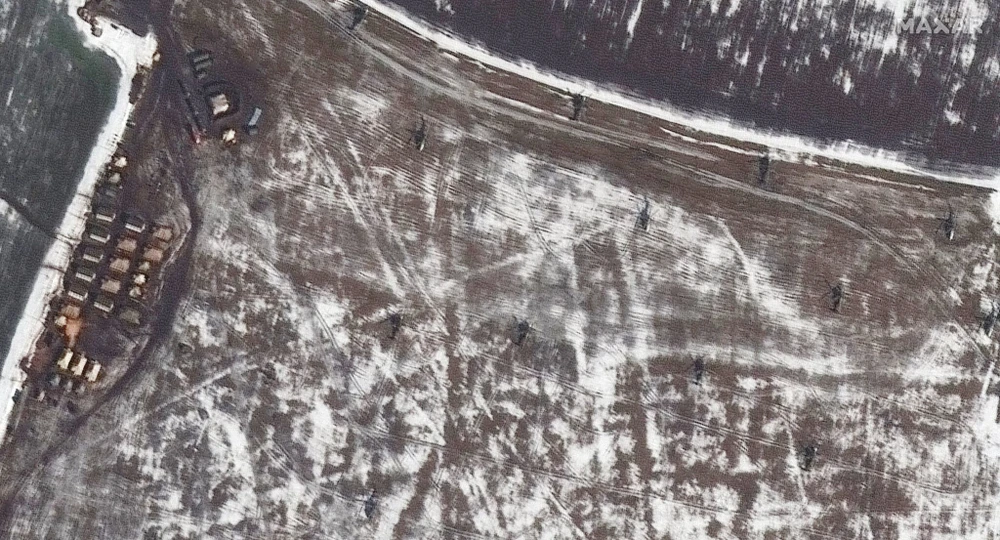 Ảnh vệ tinh cho thấy tổng quan về việc triển khai trực thăng, một nhóm chiến đấu và quân đội ở Valuyki, Nga ngày 20-2. Ảnh: MAXAR TECHNOLOGIES/REUTERS