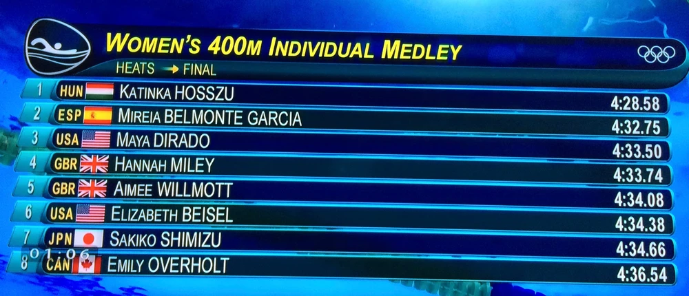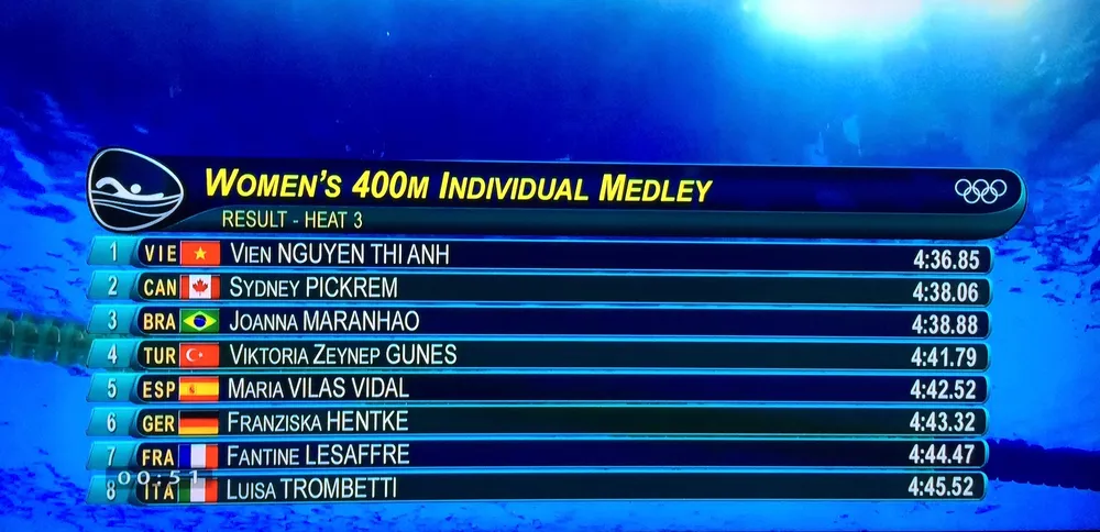 Tuy nhiên, với việc xếp hạng 9 chung cuộc vòng loại, kém 31% giây so với VĐV hạng 8 - Overholt Emily (Canada), Ánh Viên không lọt vào tốp tám VĐV giành quyền thi đấu đợt bơi chung kết.