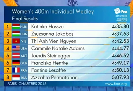Trước đó, ở chặng 1 FINA World Cup 2015 tại Moscow (Anh), Ánh Viên cũng giành 1 HCB và 1 HCĐ ở 2 cự ly sở trường 400m hỗn hợp và 200m hỗn hợp cá nhân nữ.