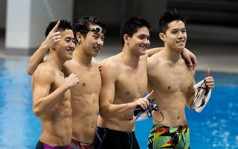 Với ngôi sao Schooling (thứ hai từ phải sang), đội tuyển bơi lội nam Singapore nhắm tới Olympic Rio 2016
