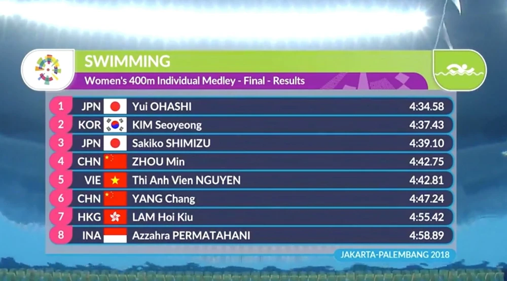 Với thành tích đợt bơi chung kết đạt 4’42”81, Ánh Viên kém VĐV giành HCV Ohashi Yui đến 8,23 giây, chỉ xếp hạng năm chung cuộc.
