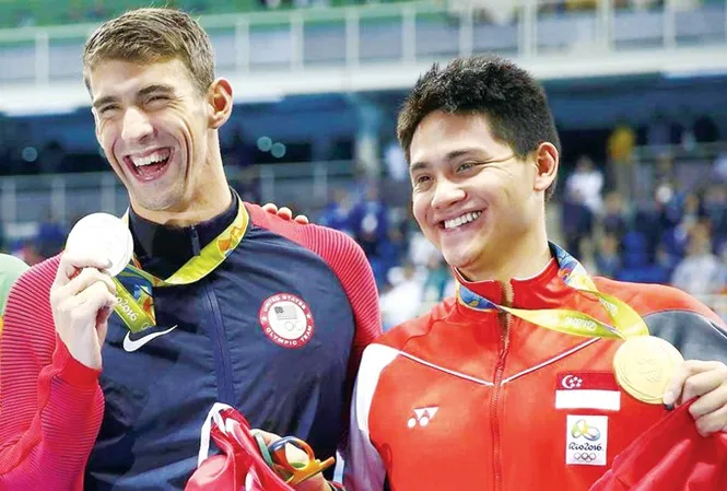 Joseph Schooling (phải) cùng độ tuổi cùng xuất sắc SEA Games 28 như Ánh Viên nhưng nay là nhà vô địch thế giới sau khi vượt qua huyền thoại Michael Phelps. Ảnh: GETTY IMAGES