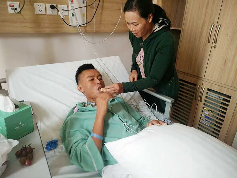 Chị Võ Thị Hoa Kim Phượng (chị gái) chăm sóc anh Võ Duy Hải sau phẫu thuật. Ảnh: ĐT