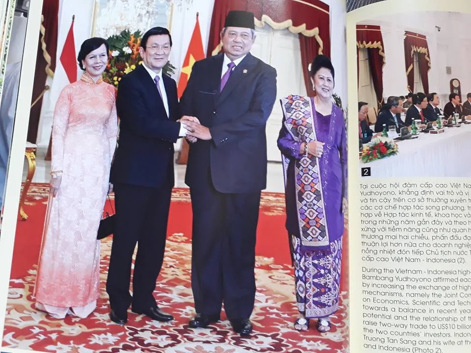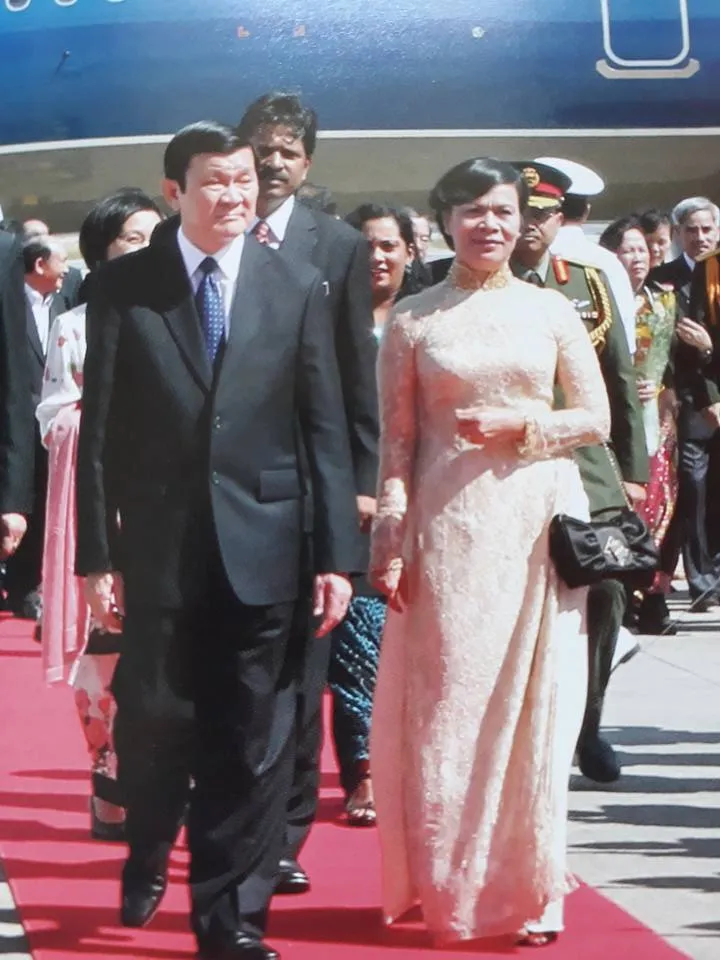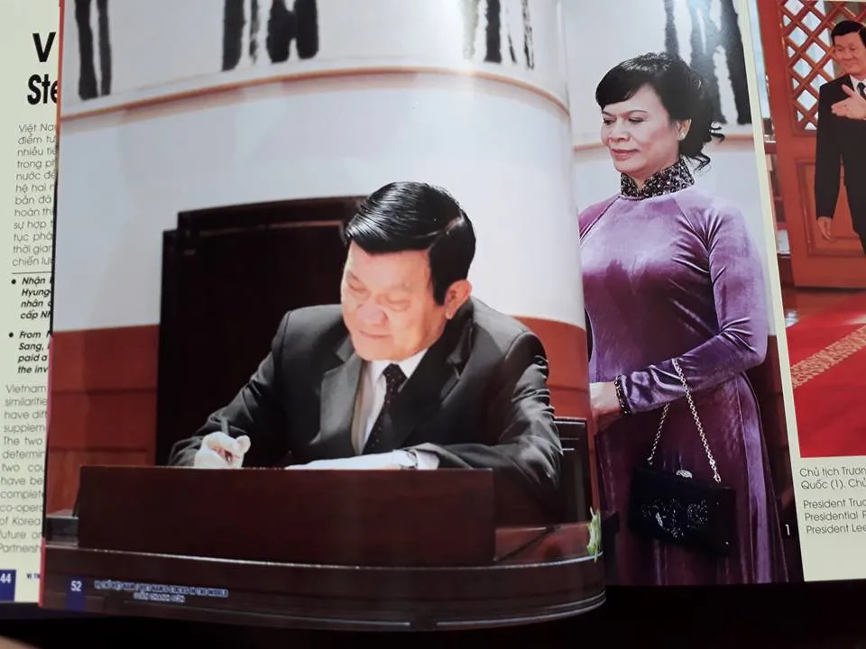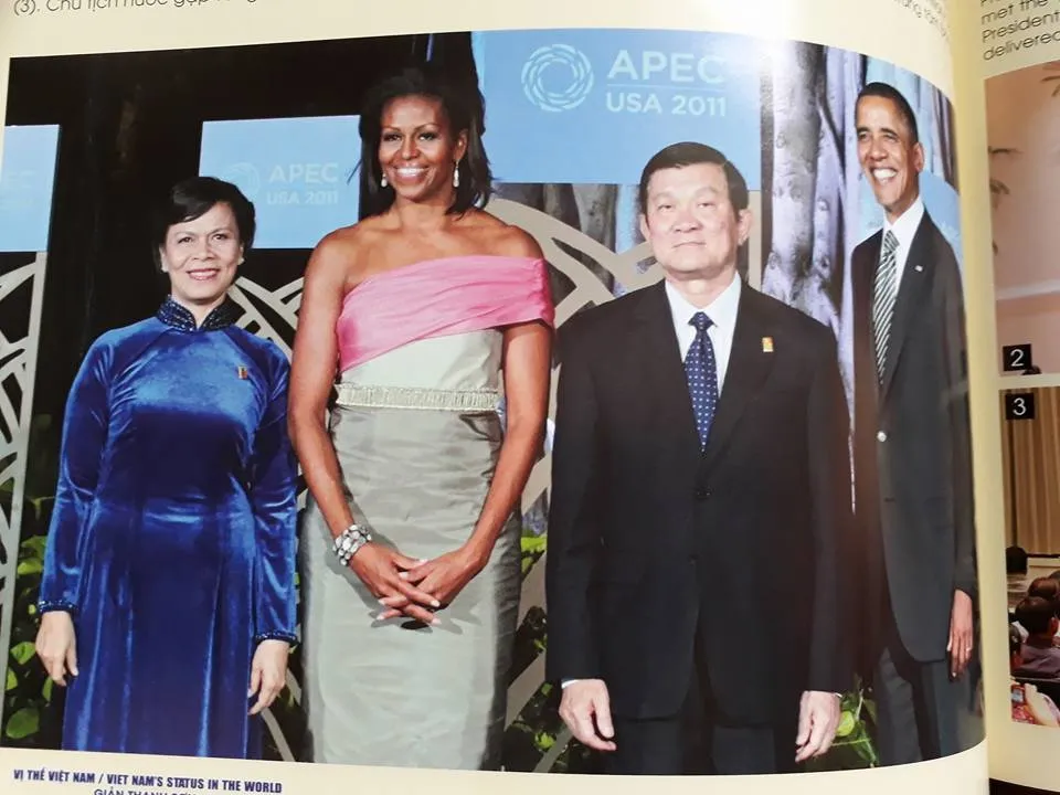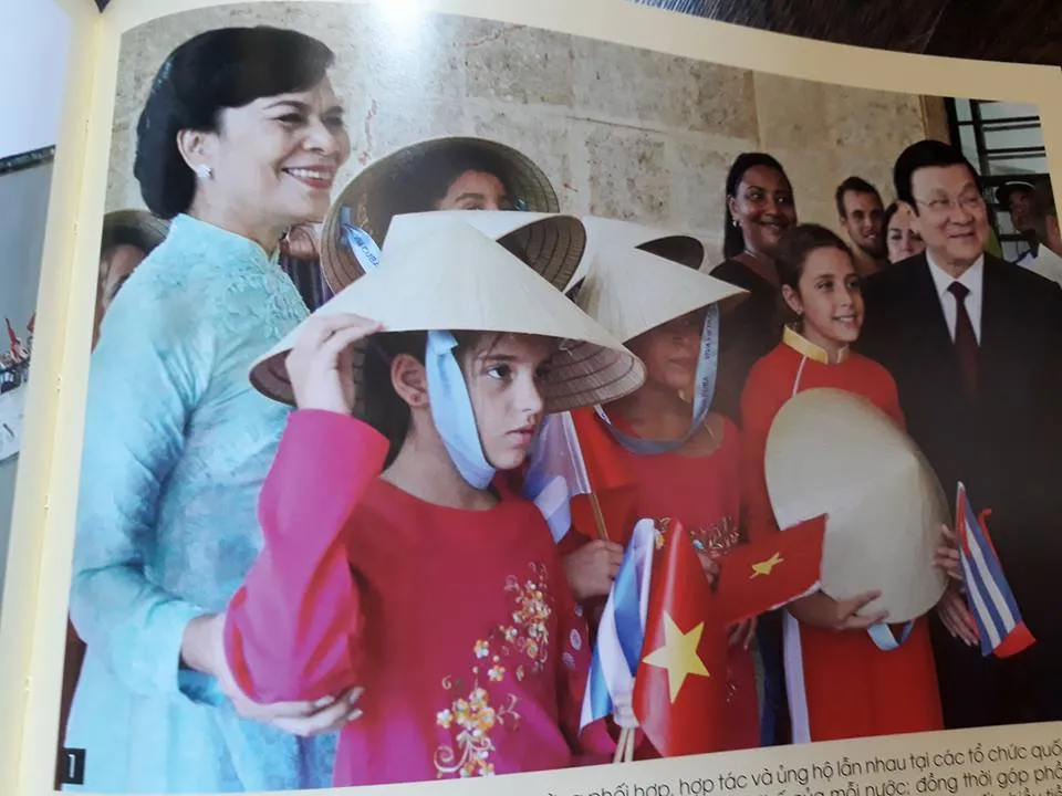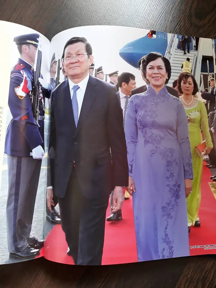 Giữa “rừng” hình ảnh các vị nguyên thủ quốc gia, các nhà ngoại giao hiện diện trong quyển sách, hình ảnh phu nhân nguyên Chủ tịch nước Trương Tấn Sang xuất hiện rất thường xuyên và để lại ấn tượng tốt đẹp trong những tà áo dài nền nã, thanh lịch.