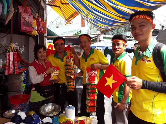 Tại chợ Tân Phước (TP.HCM), nhân viên bán hàng của Meizan tặng băng cột đầu và cờ cho tiểu thương ủng hộ U-23 Việt Nam.