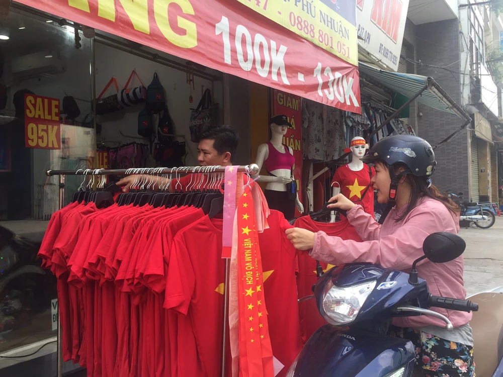 Các điểm bán cho biết giá cờ, áo, băng rôn tăng gấp hai, gấp ba ngày thường nhưng chen chân “lấy” hàng rất khó khăn. Vì đây là trận đấu lịch sử của Việt Nam nên dù giá cao nhưng nhiều người không ngần ngại bỏ tiền ra mua áo, cờ để cổ vũ.
