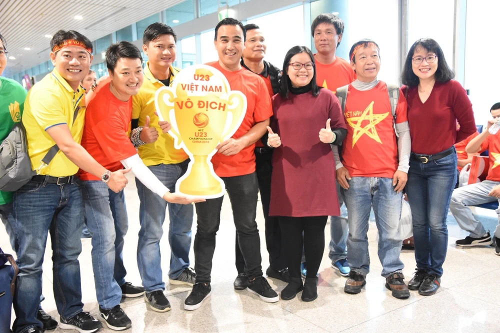 Sáng sớm 27-1, tại sân bay Tân Sơn Nhất, hàng trăm người hâm mộ trái bóng tròn và cổ động viên đã lên đường sang Thường Châu (Trung Quốc) để ủng hộ tinh thần cho những chiến binh trẻ đội nhà. Trong số hàng trăm người hâm mộ có những “sao” quen thuộc như MC Quyền Linh, diễn viên Bình Minh…