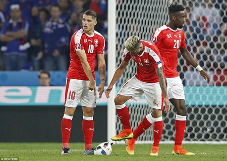 Ba cầu thủ Thụy Sĩ bị rách áo và quả bóng xịt trong trận gặp Pháp.