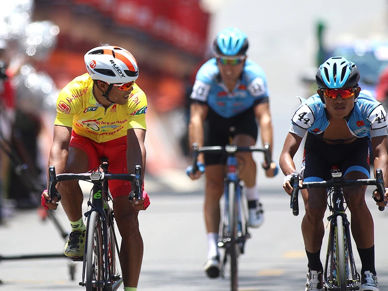 Nguyễn Trường Tài vừa chạy vừa canh đối thủ trong chặng chiến quyết định áo vàng. Ảnh: HUỲNH VĂN THUẬN