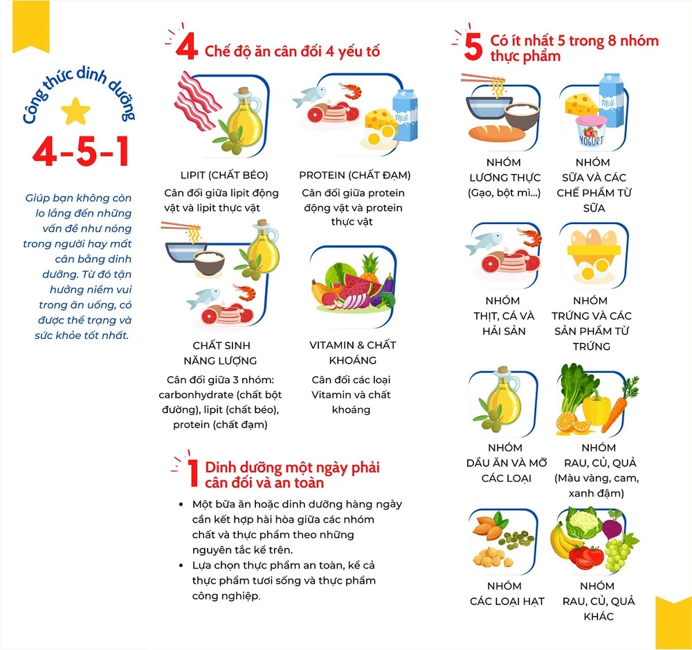 Một chế độ ăn uống cân bằng phải đạt được 4 yếu tố: cân đối giữa 3 nhóm chất sinh năng lượng, giữa đạm động vật, thực vật, chất béo động vật và thực vật, vitamin và khoáng chất. Theo đó, để đạt sự cân đối giữa 3 nhóm chất sinh năng lượng thì lượng chất đạm (protein) phải đạt từ 13-20%; chất béo (lipid) là từ 20-25%, tinh bột (carbohydrate) từ 55-65% trong bữa ăn hàng ngày.