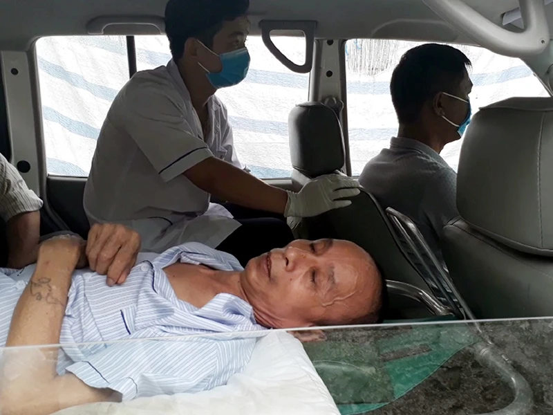 Tại nhà riêng, Hùng được các nhân viên y tế kiểm tra sức khỏe. Sau hồi lâu tiến hành các thủ tục cần thiết cũng như vận động tinh thần, Hùng được đưa lên xe cứu thương bằng cáng. Theo quan sát của PV, do bị cáo đang mang căn bệnh HIV, lực lượng cảnh sát trực tiếp thực hiện việc áp giải đều phải đeo khẩu trang y tế và găng tay dày nhằm tránh tình huống lây nhiễm có thể xảy ra.
