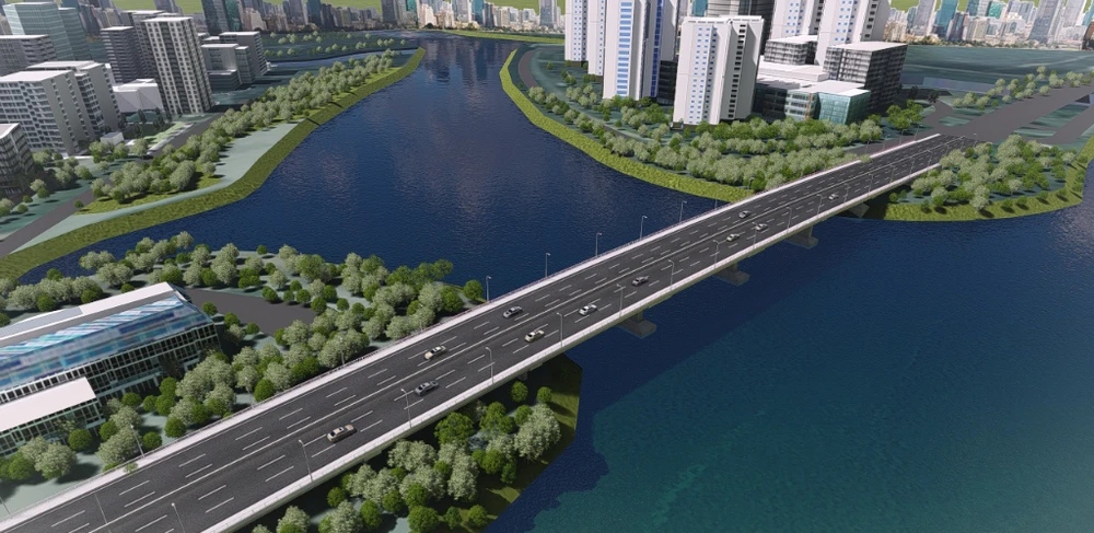Hàng loạt khu dân cư, cao ốc sẽ hình thành ở khu đô thị mới Thủ Thiêm, do đó việc xây dựng thêm nhiều cầu, đường trở thành nhu cầu cấp bách, phải đi trước. Trong ảnh: Phối cảnh cầu qua đảo Kim Cương, quận 2.