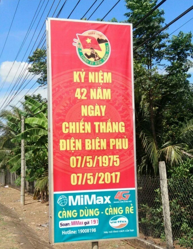 Cụ thể, hình ảnh ghi lại cho thấy các băng rôn, áp phích được treo ghi rõ các dòng chữ lớn: “Kỷ niệm 42 năm ngày chiến thắng Điện Biên Phủ 7/5/1975 - 7/5/2017” (!).
