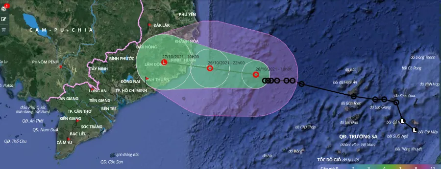 Trong 12 giờ tới, ATNĐ di chuyển chủ yếu theo hướng tây tây bắc, mỗi giờ đi được 10-15km. Đến 22 giờ ngày 26-10, vị trí tâm ATNĐ trên vùng biển từ Khánh Hòa đến Bình Thuận. Cường độ ATNĐ mạnh cấp 6-7 (40-60km/giờ), giật cấp 9.