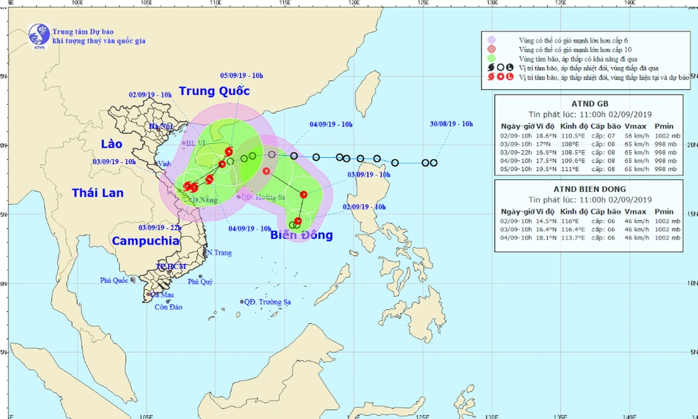 Dự báo trong 24 giờ tới, ATNĐ di chuyển theo hướng tây tây nam mỗi giờ đi được khoảng 15-20 km và có khả năng mạnh lên thành bão. Đến 10 giờ ngày 3-9, vị trí tâm bão trên vùng biển các tỉnh từ Quảng Bình đến Quảng Nam. Sức gió mạnh nhất vùng gần tâm bão mạnh cấp 8 (60-75 km/giờ), giật cấp 10.