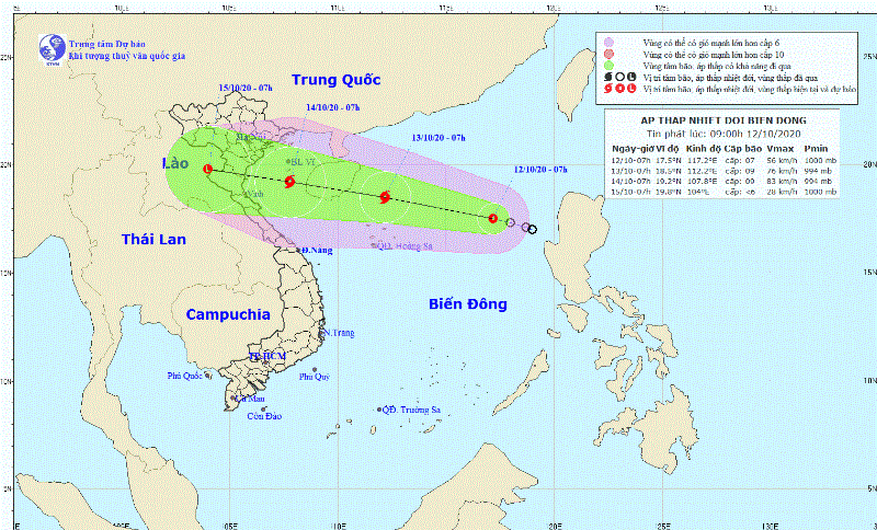Sáng 12-10, Trung tâm Dự báo Khí tượng thủy văn quốc gia cho biết vào 7 giờ sáng, vị trí tâm áp thấp nhiệt đới (ATNĐ) còn cách quần đảo Hoàng Sa khoảng 550km về phía đông đông bắc.