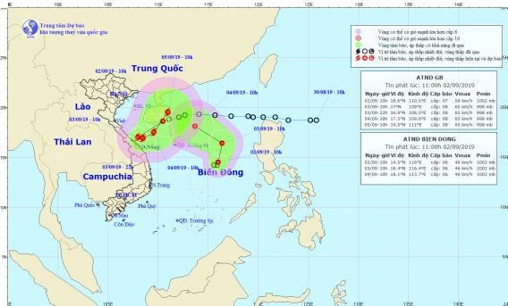 Hồi 10 giờ ngày 2-9, vị trí tâm áp thấp nhiệt đới ở phía đông đảo Hải Nam với sức gió mạnh cấp 6-7 (40-60 km/giờ), giật cấp 9. Theo Trung tâm Dự báo khí tượng thủy văn trung ương, trong 24 giờ tới, áp thấp nhiệt đới di chuyển theo hướng tây tây nam mỗi giờ đi được khoảng 15-20 km và có khả năng mạnh lên thành bão.