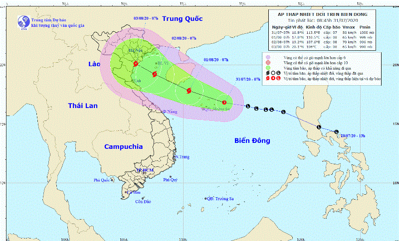 Theo Trung tâm Dự báo khí tượng thủy văn quốc gia, sáng nay (31-7), áp thấp nhiệt đới (ATNĐ) cách quần đảo Hoàng Sa 160km. Sức gió mạnh nhất vùng gần tâm ATNĐ mạnh cấp 6-7, giật cấp 9.