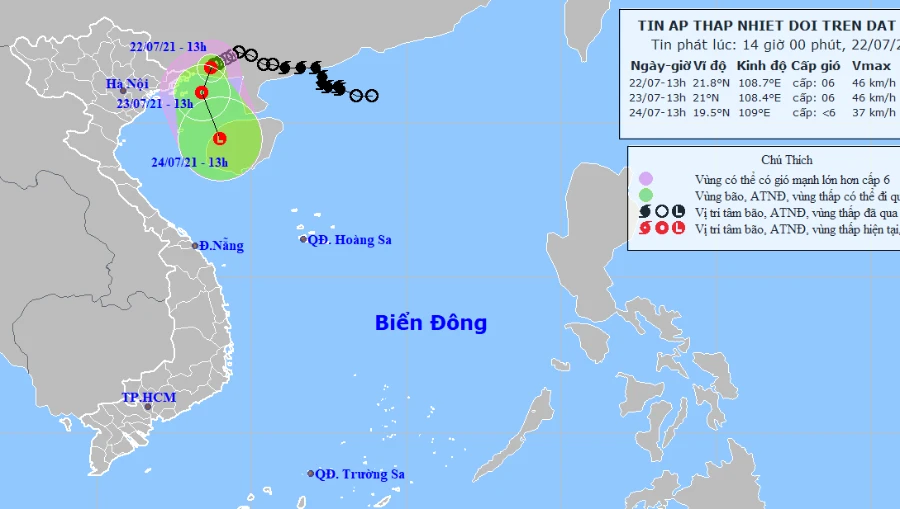 Theo Trung tâm Dự báo Khí tượng thủy văn quốc gia, lúc 13 giờ chiều nay, 22-7, áp thấp nhiệt đới (ATNĐ) ở ngay trên vùng ven biển phía nam tỉnh Quảng Tây (Trung Quốc).
