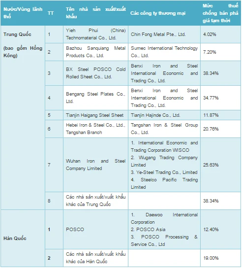 Cụ thể, mức thuế chống bán phá giá tạm thời đối với sản phẩm thép mạ có xuất xứ từ Trung Quốc (bao gồm Hong Kong) và Hàn Quốc:
