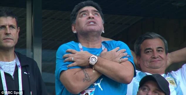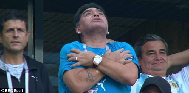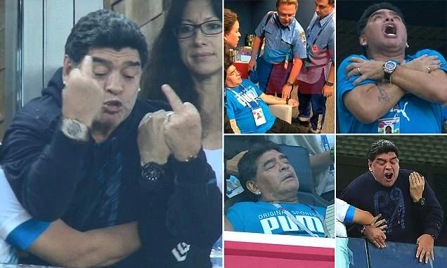 Trước trận đấu, Maradona xuất hiện trên khán đài VIP ủng hộ Argentina. Ông đã làm rất nhiều cử chỉ khác nhau nhằm thể hiện tình yêu với Argentina. Tuy nhiên, huyền thoại bóng đá thế giới Maradona còn khiến nhiều người ngạc nhiên khi không hiểu vì sao ông lại giơ ngón tay thối và cả chửi thề.