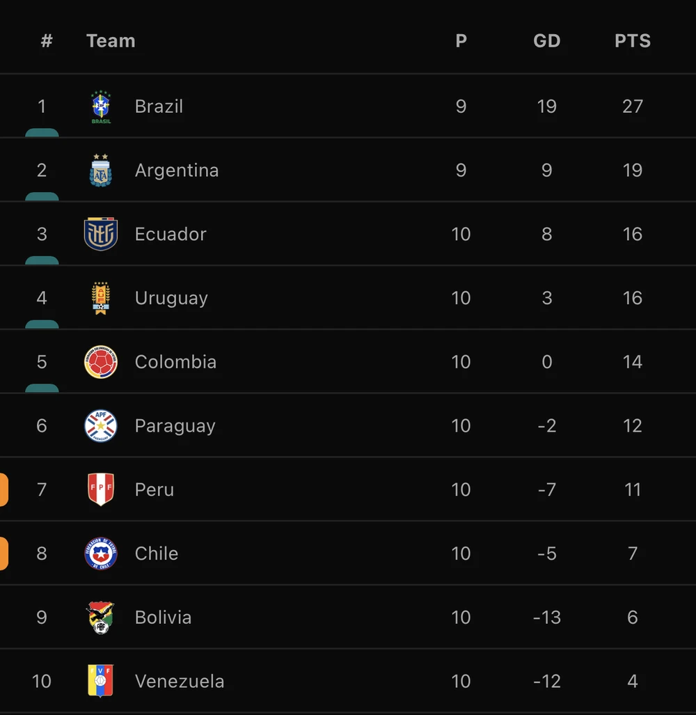BXH Vòng loại World Cup 2022 khu vực Nam Mỹ: