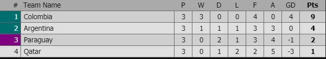 Trận đấu cùng giờ ở bảng B, Colombia dù đã chắc ngôi đầu bảng nhưng vẫn đánh bại Paraguay bằng bàn thắng duy nhất phút 31 của Gustavo Cuellar. Như vậy, kết thúc vòng bảng, Colombia dẫn đầu với 9 điểm tuyệt đối cùng với đội nhì bảng Argentina 4 điểm đi tiếp.