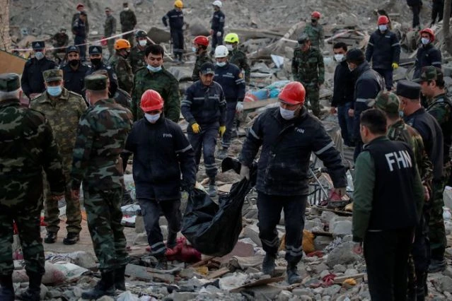 Các đội tìm kiếm và cứu hộ mang một thi thể từ khu vực bị tên lửa tấn công ở Nagorno-Karabakh, Azerbaijan ngày 17-10. Ảnh: REUTERS