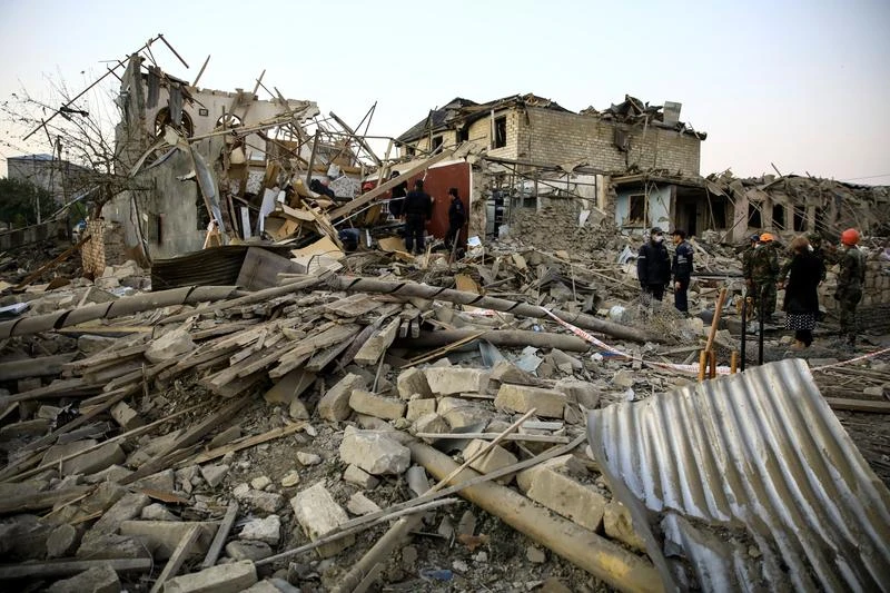 Các đội tìm kiếm và cứu hộ có mặt tại khu vực bị tên lửa đánh trúng ở khu vực tranh chấp Nagorno-Karabakh, Azerbaijan ngày 17-10. Ảnh: REUTERS
