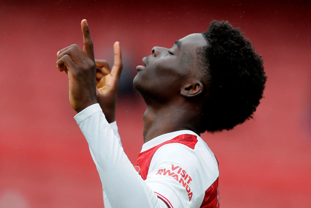 Saka ăn mừng bàn thắng mở tỉ số. ẢNH: GETTY IMAGES