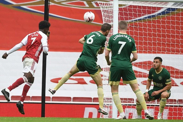 Trước sức ép dữ dội của Arsenal, đội khách cuối cùng cũng không trụ được. Phút 61, sau pha phối hợp rất hay trước vòng cấm Sheffield United, Bellerin tạt bóng vào chuẩn xác cho Bukayo Saka đánh đầu thoải mái ở cự ly gần tung lưới Ramsdale mở tỉ số 1-0 cho Arsenal.