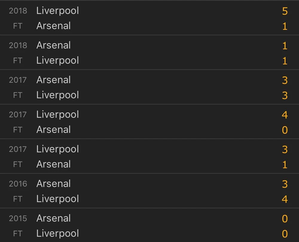 Liverpool không biết thua Arsenal trong bảy trận gần nhất hai đội gặp nhau.