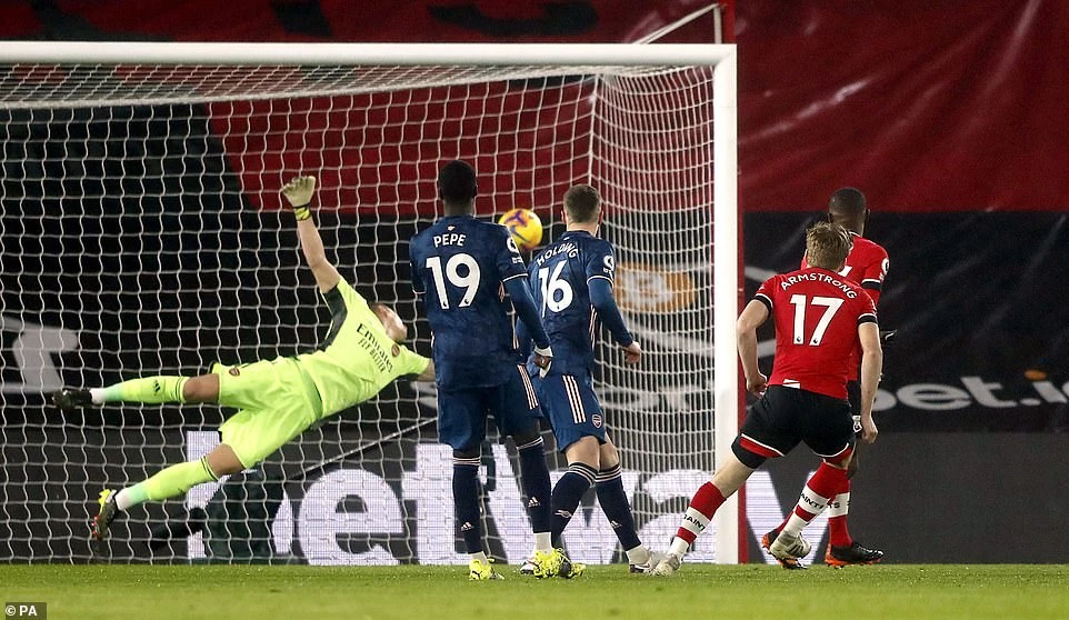 Arsenal là đội thi đấu lấn lướt với tỷ lệ cầm bóng lên đến 58% và tung ra được 13 cú sút trong suốt 90 phút. Nhưng đội bóng của Arteta lại bất ngờ nhận bàn thua sớm ngay phút thứ 3. Từ tình huống dàn xếp đá phạt góc có ý đồ của chủ nhà Southampton, bóng đến chân Armstrong mà không có cầu thủ nào của Arsenal theo kèm. Số 17 của đội chủ nhà dễ dàng băng vào dứt điểm mở tỷ số bằng pha bắt vô-lê, giúp Southampton vươn lên dẫn trước 1-0.