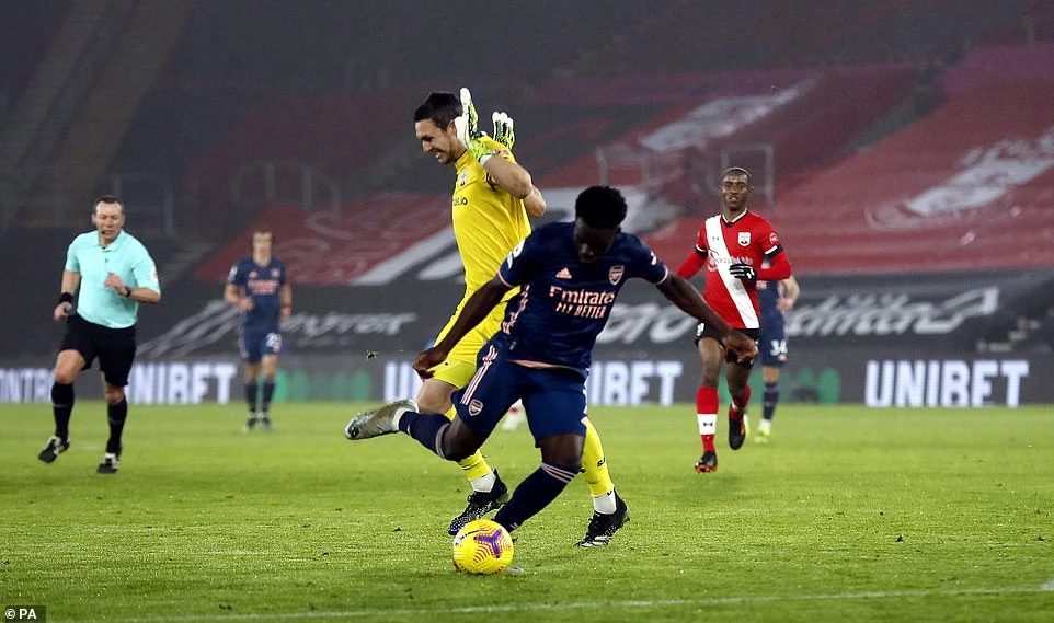 Saka loại bỏ hàng thủ và thủ môn của Southampton để ghi bàn nâng tỷ số lên 2-1 cho Arsenal. Ảnh: PA.