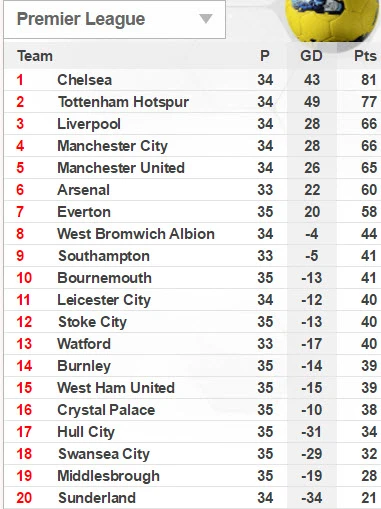 Bảng xếp hạng Premier League: