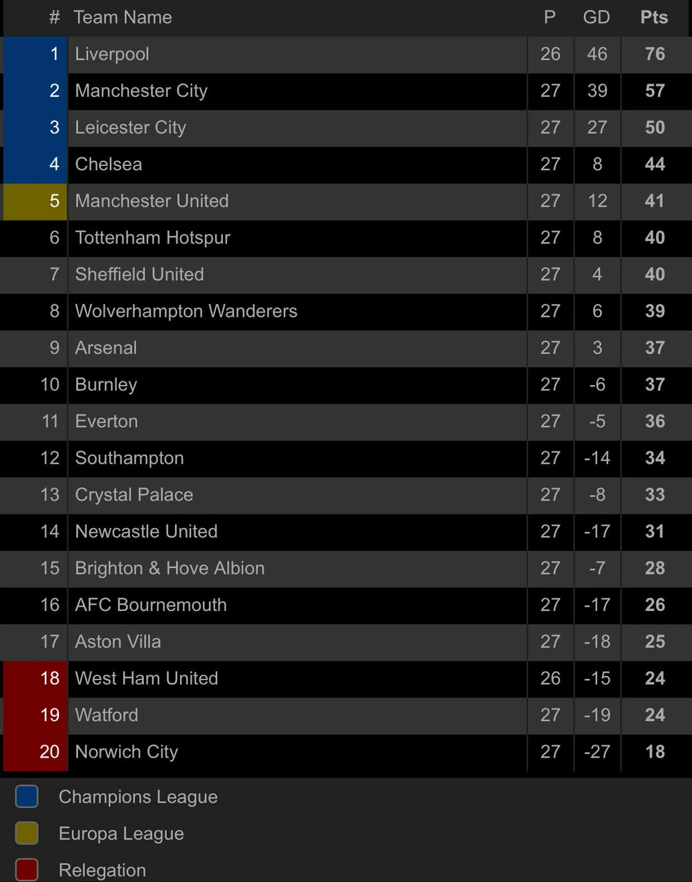 BXH Premier League: