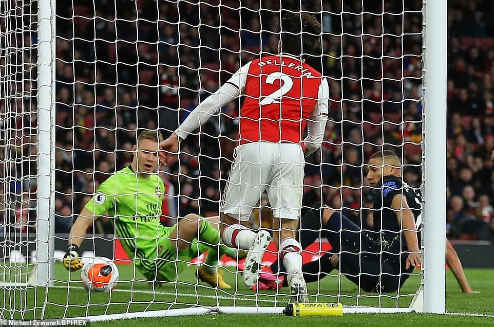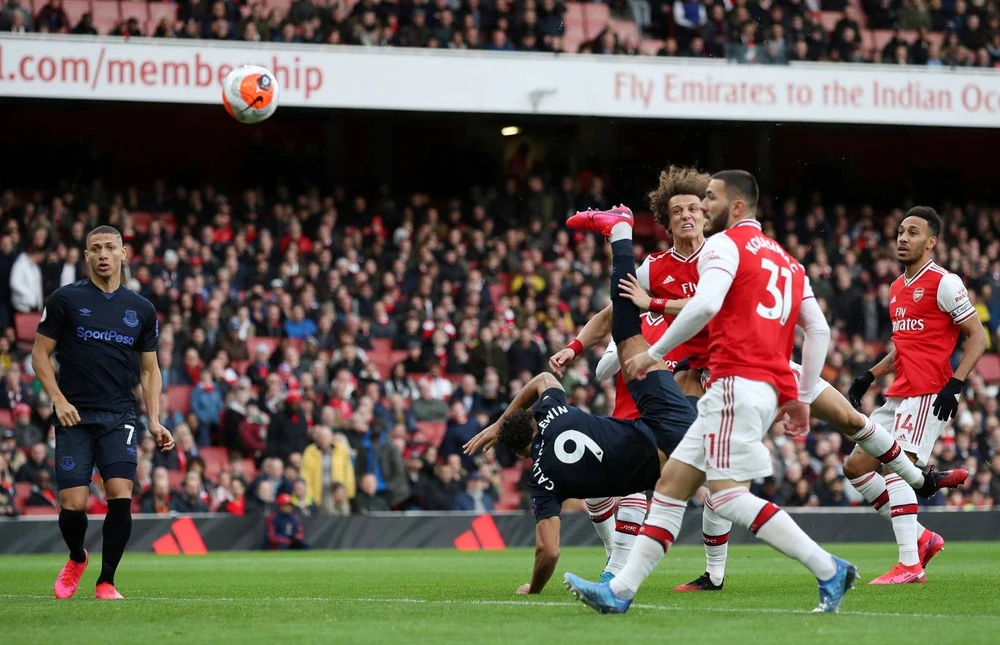 Tuy nhiên, gặp phải đối thủ khó chịu là Everton, lưới của “Pháo thủ” bất ngờ rung lên ở giây 49. Từ tình huống Everton được hưởng đá phạt chếch bên phải vòng cấm, trung vệ David Luiz của đội chủ nhà đánh đầu phá bóng hỏng. Bóng từ đầu của trung vệ người Brazil đi đến đúng vị trí của tiền đạo Calvert-Lewin, trung phong của Everton tung người lập siêu phẩm ngã bàn đèn giúp Everton vươn lên dẫn trước 1-0.