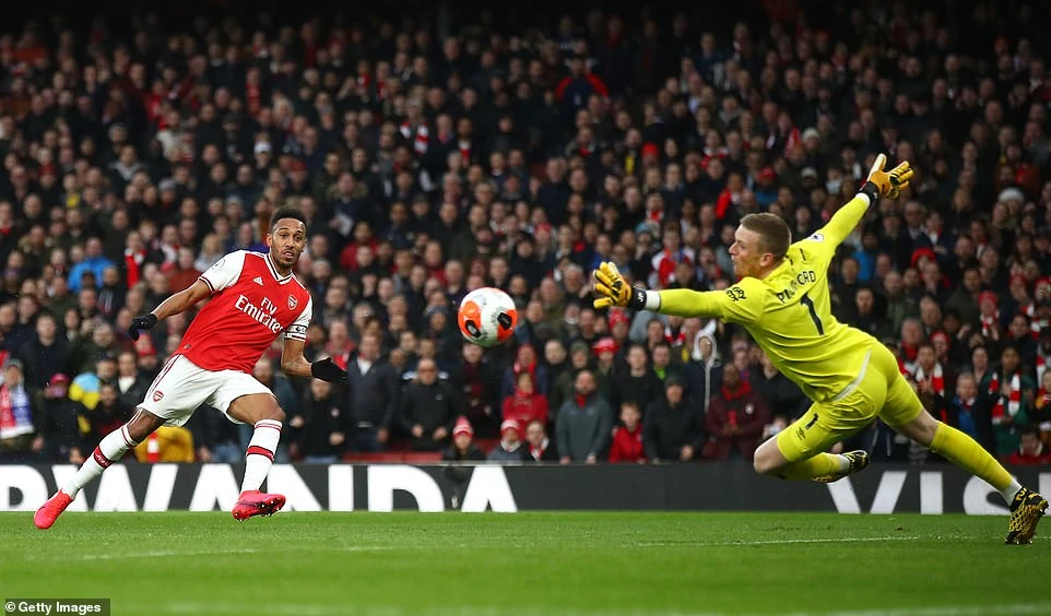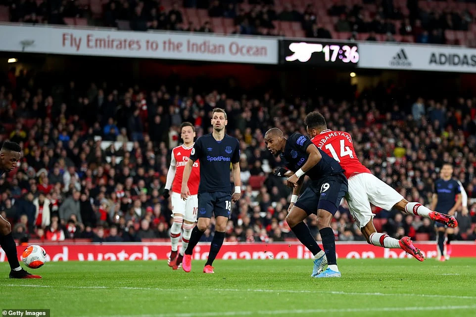 Trung vệ David Luiz có đường chọc khe từ giữa sân đánh sập toàn bộ hệ thống phòng ngự của Everton để cho Aubameyang xâm nhập vòng cấm. Trong tư thế đối diện khung thành của thủ môn Pickford, tiền đạo người Gabon dứt điểm vào góc xa để ghi tên mình lên bảng điện tử.