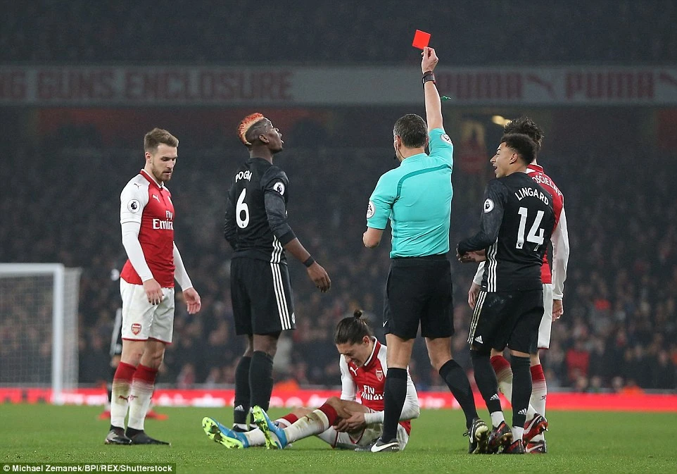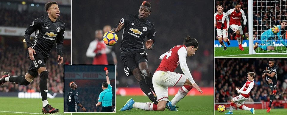 Tuy vậy, sau đó Pogba lại nhận thẻ đỏ trực tiếp sau tình huống ham bóng đạp thẳng vào chân Bellerin ở phút 74. Khoảng 20 chút còn lại kể cả 5 phút bù giờ, HLV Wenger quyết định chơi tất tay khi tung cặp tiền đạo Welbeck và Giroud vào sân nhưng Arsenal vẫn không thể xuyên thủng được mành lưới MU.