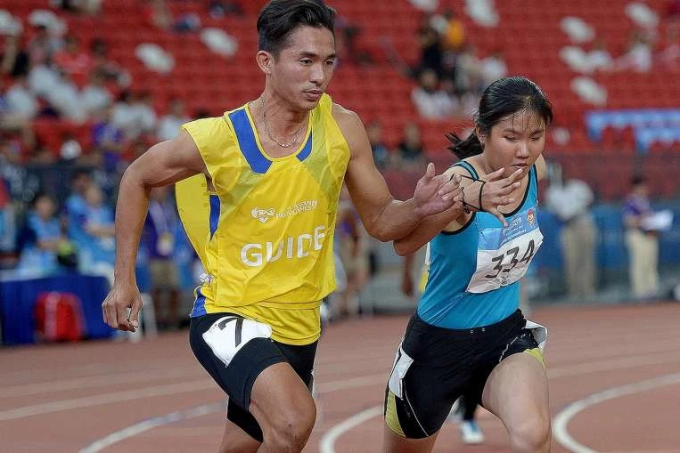VĐV Nguyễn Tấn Phát hỗ trợ cho VĐV khiếm thị Nguyễn Ngọc Quỳnh Trâm thi một nội dung của điền kinh.